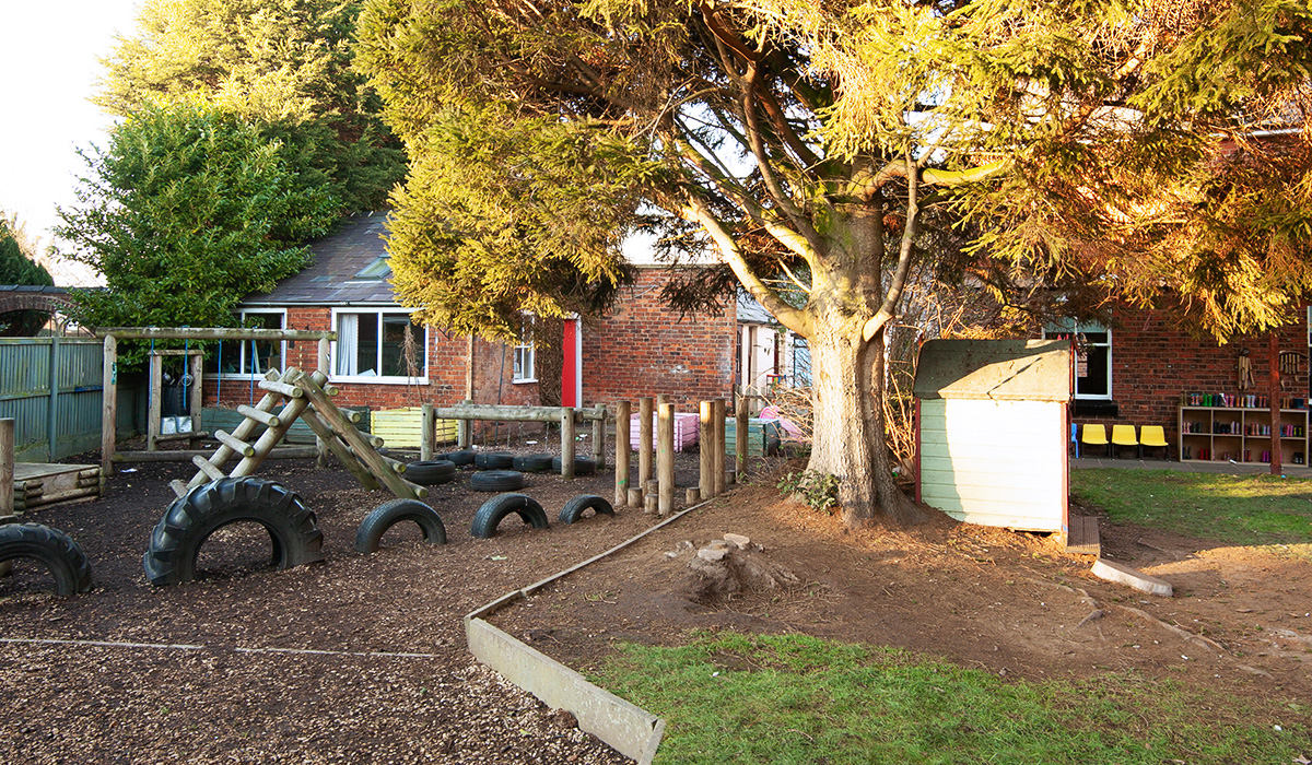 Children at Kids Corner nursery benefit from extensive outdoor play and exploration space and are surrounded by nature and trees with cows and sheep in the surrounding fields.