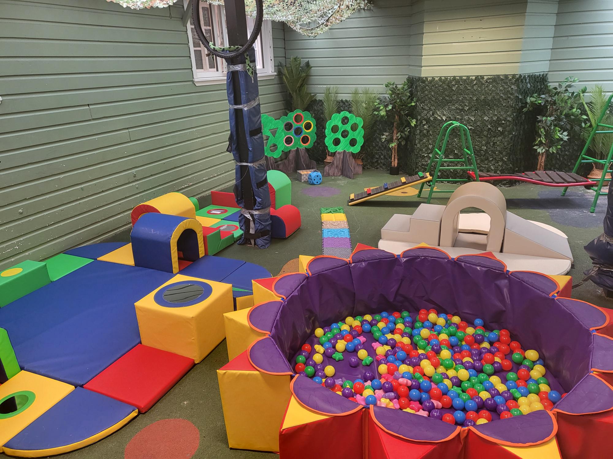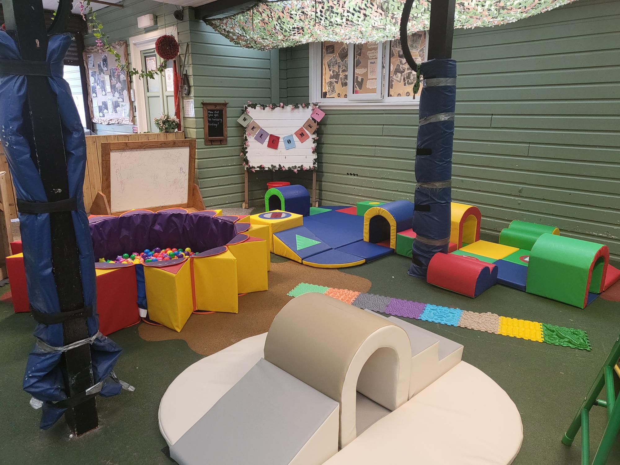 We have a sheltered play area containing soft play items which help children to develop their motor skills, balance and coordination as well as engage in “risky play” which empowers children to develop their problem-solving skills, overcome fears and create boundaries.