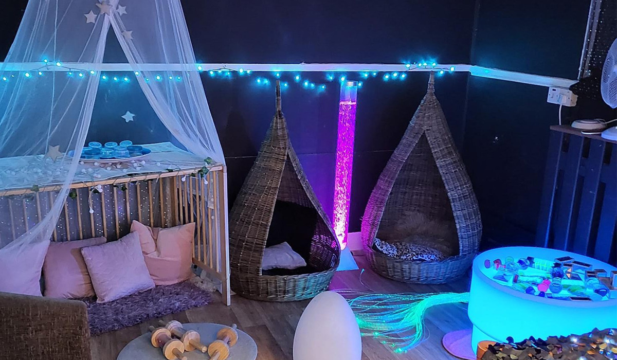 A large sensory room with stimulating lights and colours, designed for babies